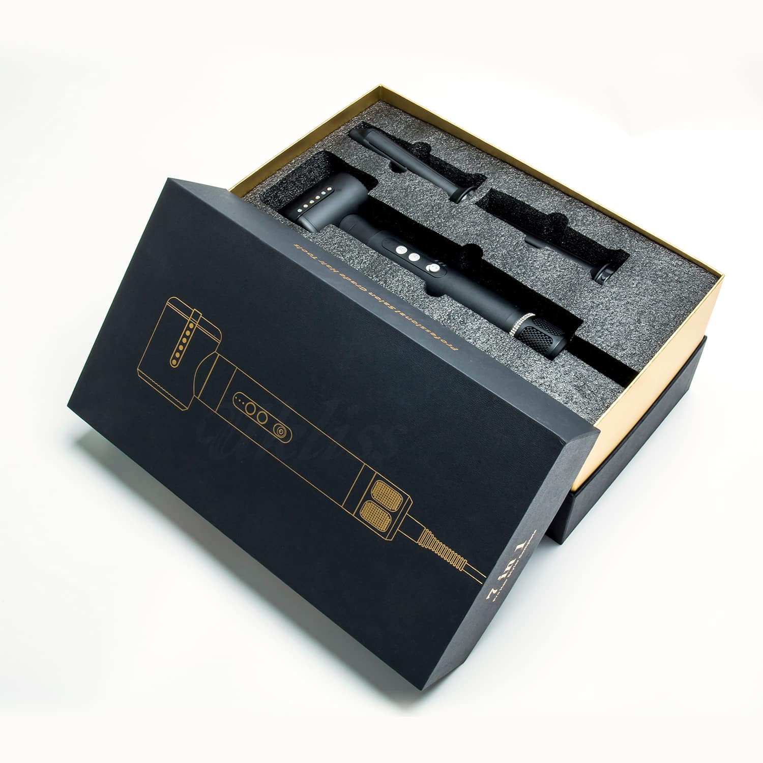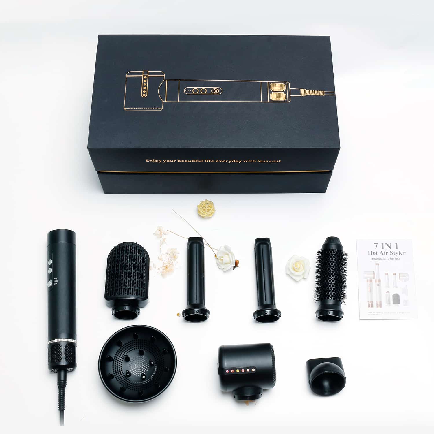 ▻ 7 embouts différents : 1 sèche-cheveux, 2 boucleurs, 1 brosse ronde, 1 brosse plate, 1 embout plat fin, 1 diffuseur